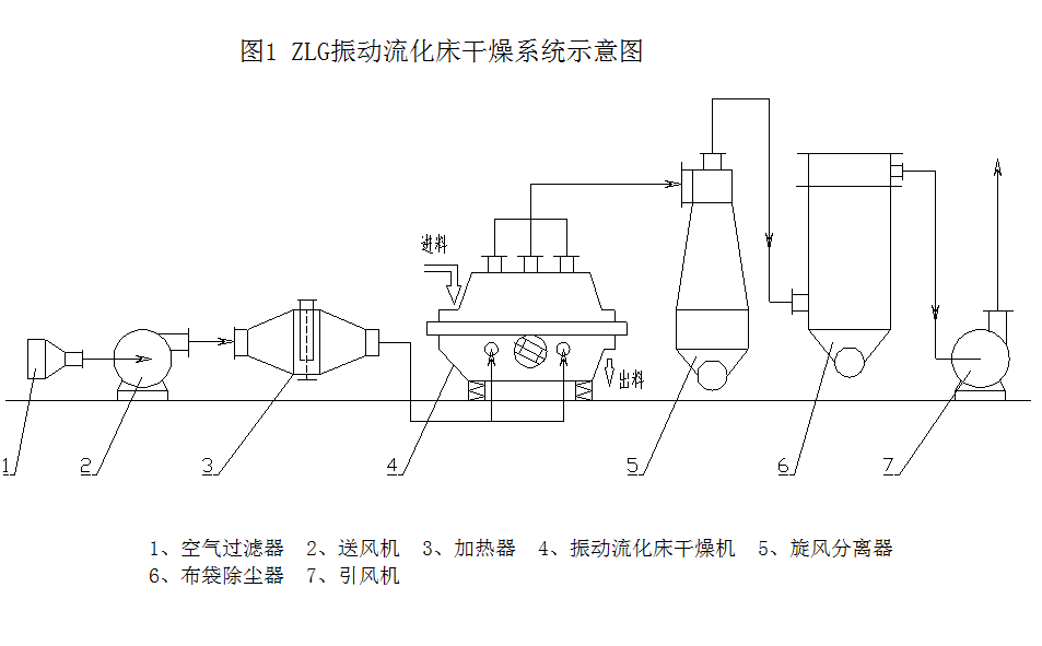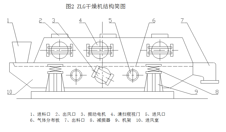 圖1是ZLG振動(dòng)流化床干燥系統(tǒng)示意圖。ZLG是干燥系統(tǒng)的主體設(shè)備, 主要由以下幾部分組成: 1、進(jìn)出風(fēng)機(jī)構(gòu),包括進(jìn)風(fēng)口、進(jìn)風(fēng)室及氣體預(yù)分布器、氣體分布板及出風(fēng)口);2、床體,包括上下箱體及之間軟連接, 兩端進(jìn)出料口;3、振動(dòng)機(jī)構(gòu),包括振動(dòng)電機(jī)、減振器、機(jī)架等,見圖2。