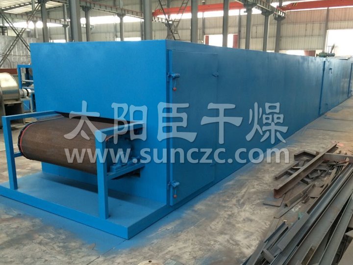 物料由加料器均勻地鋪在網帶上,網帶一般采用12-60目不銹鋼絲網,由傳動裝置拖動在干燥機內移動。干燥機由若干單元組成,每一單元熱風獨立循環(huán),部分尾氣由專門排濕風機排出,廢氣由調節(jié)閥控制,熱氣由下往上或由上往下穿過鋪滿物料的網帶完成熱量與質量傳遞的進程,帶走物料水份。網帶緩慢移動,運行速度可根據物料溫度自由調節(jié),干燥后的成品連續(xù)落入收料器中。上下循環(huán)單元根據用戶需要可靈活配備,單元數量亦可根據需要選取。
